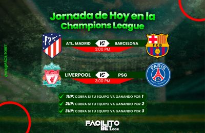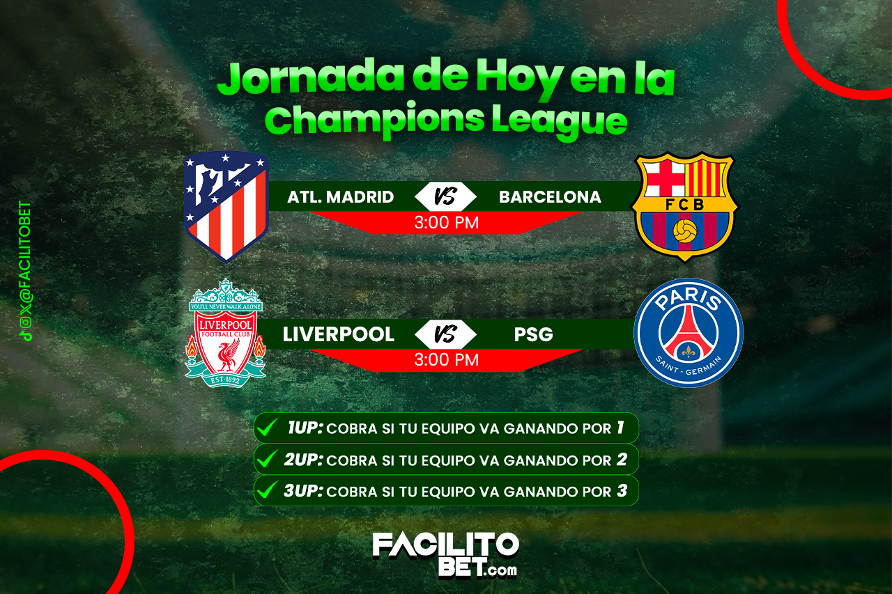 La UEFA Champions League define este martes a sus primeros semifinalistas con dos partidazos de alto voltaje: Liverpool vs PSG y Atlético de Madrid vs Barcelona. Una jornada ideal para vivir el mejor fútbol del mundo y aprovechar en FacilitoBet una ventaja que marca diferencia: el 1UP, 2UP y 3UP.