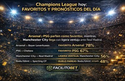 La Champions League trae una jornada llena de emoción. Arsenal parte como favorito ante Bayer Leverkusen, PSG tiene ventaja frente a Chelsea y Manchester City sale ligeramente por encima de Real Madrid en el partidazo del día. El duelo entre Bodo Glimt y Sporting CP luce como el más parejo de la jornada.