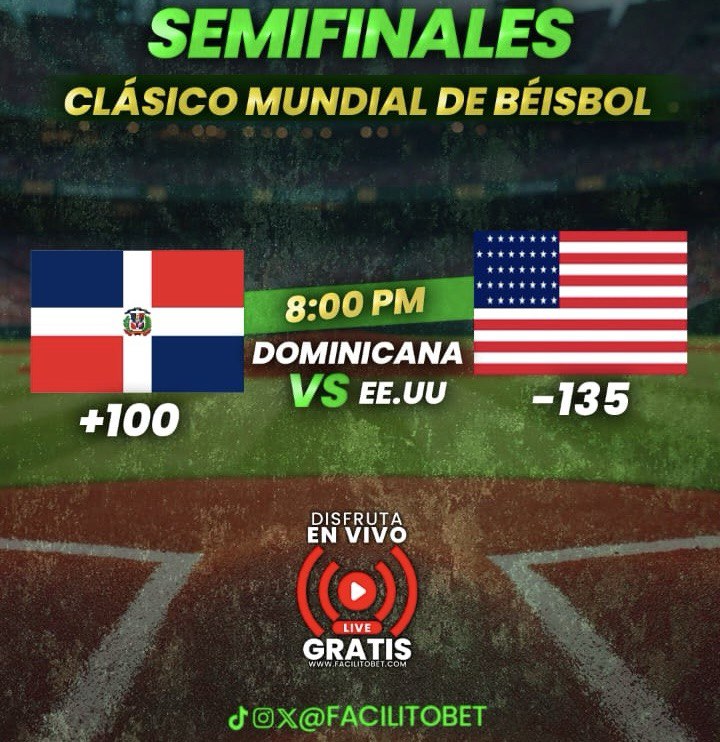 Para este gran duelo, las cuotas publicadas en nuestra plataforma muestran a Estados Unidos como favorito con -135, mientras que República Dominicana aparece con +100, en un partido que promete mucha intensidad desde el primer inning.