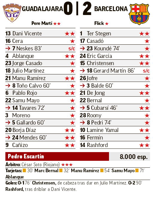En la segunda parte Flick sacó a Cubarsí por Bernal, que tenía amarilla y se la jugó en alguna falta por llegar tarde. El cambio propició un nuevo reajuste pasando Casadó al medio centro y Eric García al lateral. El cuadro catalán salió dispuesto a resolver y que no se complicara la noche. Rashford tuvo un mano a mano nada más reanudarse el partido, pero Dani Vicente lo evitó con una parada con el pie. Pero fue un espejismo porque el Barça se diluyó y volvió a tener problemas para superar la cerrada y cada vez más cansada defensa del Guadalajara.