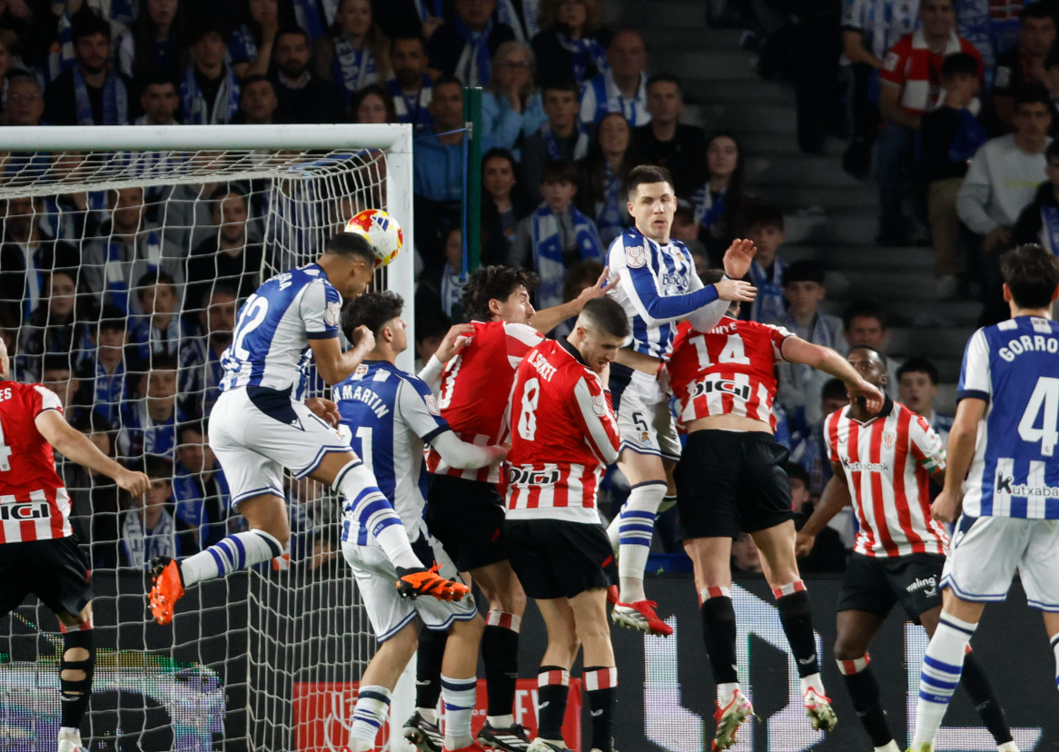 A pesar de la superioridad con pelota del Athletic, la Real también metió miedo con un testarazo de Jon Martín que se marchó por encima de la portería de Padilla. En el minuto 61, nuevamente Soler no pudo rematar un pase picado de Oyarzabal, y en la siguiente acción el recién incorporado Yangel cabeceó alto a la salida de otro córner.